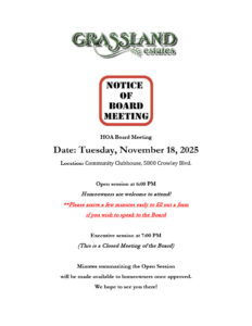 Grassland Estates Related postsEaster Egg HuntMarch 13, 2024November 2025 Board MeetingNovember 13, 2025NOTICE OF ANNUAL MEETING OF THE MEMBERS OF THE GRASSLAND ESTATESApril 17, 2025 Previous postNext postSeptember Newsletter